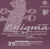 Por el Grupo Enigma en su II Programa del año El Grupo Enigma, Orquesta de Cámara del Auditorio de Zaragoza, ofreció el martes, 25 de noviembre de 2003, en la sala Luis Galve del Auditorio de Zaragoza, un Concierto monográfico del compositor contemporáneo aragonés Ángel Oliver Pina (Moyuela, 1937), bajo la batuta de su director titular, Juan José Olives. PRIMERA PARTE
