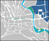 Situado entre la carretera y el río; al hacer nuestra entrada